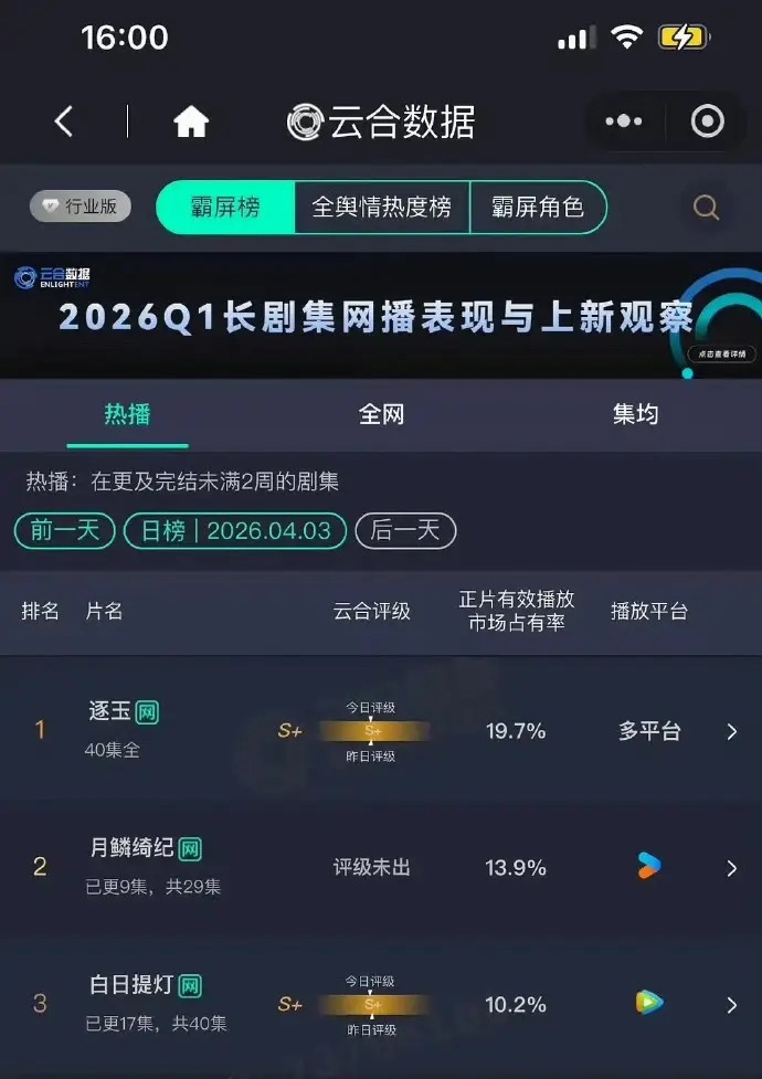 这部剧定档后,碰巧遇到迪丽热巴换经纪人,所以宣传特别给力,提升了好几个档次,最初,这部剧的热度还是不错的,可《月鳞绮纪》开播第三天,就将《白日提灯》挤掉了,冲到榜单第二的位置。